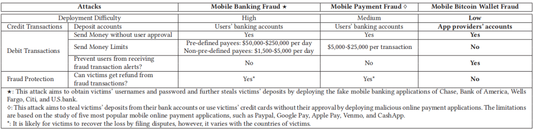 与其他欺诈攻击的比较:这种攻击不需要复杂的攻击技术,但是与其他类型的金融欺诈攻击(1)手机移动银行欺诈攻击和(2)手机移动支付欺诈攻击相比,此攻击的负面影响是深远的。前一种攻击旨在获取受害者的用户名和密码,并通过部署伪造的移动银行应用程序(例如,Chsae是Chase应用程序的伪造版本)进一步窃取受害者的存款。后一种攻击旨在通过部署类似于Paypal,Venmo,CashApp的恶意在线支付应用程序,从受害者的银行帐户中窃取受害者的存款或未经受害者批准使用信用卡。从四个方面将设计的比特币欺诈攻击与这两种攻击进行了比较:(1)部署难度,(2)信用交易,(3)借记交易和(4)欺诈保护。