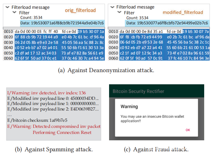 评估结果如上图所示。对于比特币去匿名攻击,Rectifier可以拦截具有低默认误报率的Bloom过滤器,并通过添加不属于受害者的比特币地址来保护它(请参见图a )。因此,攻击者无法准确推断受害者拥有的所有比特币地址。对于比特币垃圾信息攻击,图b显示Rectifier可以拦截收到的恶意比特币库存消息,对其进行检查,并与恶意比特币FNC断开连接。对于比特币欺诈攻击,图c确认Rectifier已成功检测到用户是否使用非P2P比特币钱包应用程序,并为用户提供了安全警告。