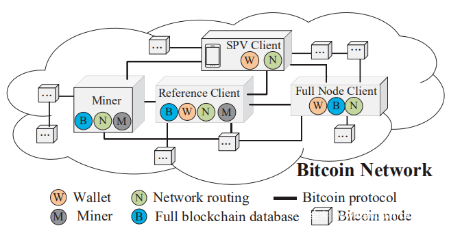 比特币网络架构:下图说明了比特币网络架构。运行比特币协议的网络节点可能包含四个功能:(1)钱包,(2)矿工,(3)完整的区块链数据库和(4)网络路由。钱包功能为用户提供了比特币钱包服务。此功能控制对用户资金(即BTC,比特币的货币)的访问,包括管理私钥/公钥和地址,跟踪余额以及生成和签名交易。矿工功能瓦利约会新交易并将其附加到比特币区块链。完整的区块链数据库功能可维护所有比特币区块的完整且最新的副本。网络路由功能允许一个节点与其他节点通信。