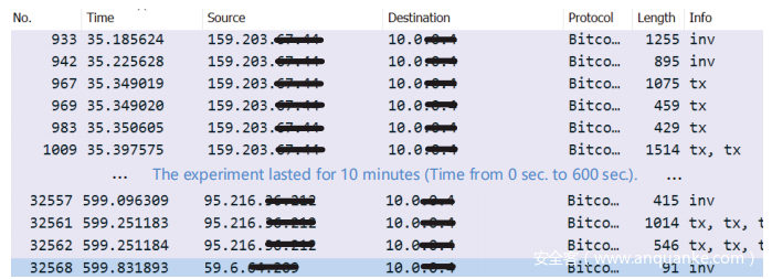 上图说明了在10分钟的实验运行中,SPV客户端从连接的FNC接收了130条清单消息并下载了2535比特币交易。有三个观察结果。首先,所有下载的比特币交易均不涉及经过测试的SPV客户端曾经使用过的任何比特币地址。其次,SPV客户并未与FNC断开连接,因为FNC出于SPV客户的利益而传输了大量比特币交易。第三,SPV客户端没有向用户显示任何警报或通知(例如,遭受垃圾信息攻击)。这些证实了SPV客户端和BitcoinJ在下载它们之前均未验证是否关注比特币交易,并且未采用任何其他安全机制来阻止由连接的FNC发送的垃圾信息。