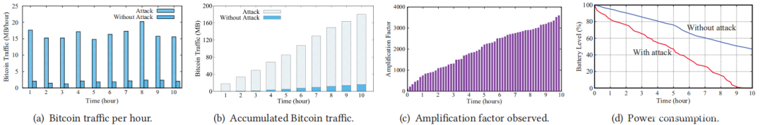 1)垃圾信息流量:上图a-c分别绘制了每小时比特币垃圾信息流量,累积的比特币垃圾信息流量以及在受害者身上观察到的放大系数。有三个观察结果。首先,受到攻击的手机每小时将接收14-20 MB的比特币流量,而不受攻击的手机每小时将仅接收1-2 MB的比特币流量。其次,在10小时的实验中,受害者的手机接收到约164 MB的内存,而不受攻击的手机仅接收了16 MB的内存。这表明攻击者可以向受害者连续产生比特币垃圾信息流量。如果受害者正在使用蜂窝网络数据服务访问比特币网络,则他们必须为垃圾信息流量支付费用。第三,在实验结束时,攻击放大系数增加到3666左右。请注意,垃圾信息不必要的流量来自攻击期间所有全球比特币用户产生的新比特币交易。因此,当更多的用户使用比特币服务时,该系数可能会增加。
