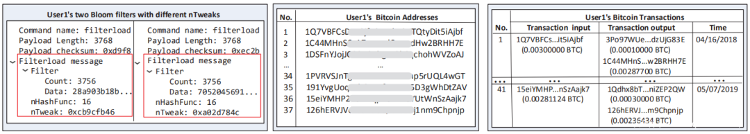 2)在收到推断的用户身份和用户的IP地址后,该模块通过上述Wi-Fi取消身份验证攻击获得两个过滤器,应用这两个过滤器来发现SPV客户端使用的所有比特币地址(Bitcoinwallet应用程序),并检索所有相关的比特币交易。上图说明了该模块如何在一次实验运行中对与参与者U1使用的比特币钱包相关的所有比特币地址和比特币交易进行匿名处理。图左、中和右分别显示(1)使用不同nTweaks生成的两个filterload消息,(2)成功通过两个过滤器的比特币地址,(3)所有比特币分别与发现的比特币地址有关的交易。参与者U1完成了最后一笔比特币交易(No. 41),目的是在此次实验运行期间将0.0003 BTC转移到比特币地址之一;参与者U1确认了这个结果。
