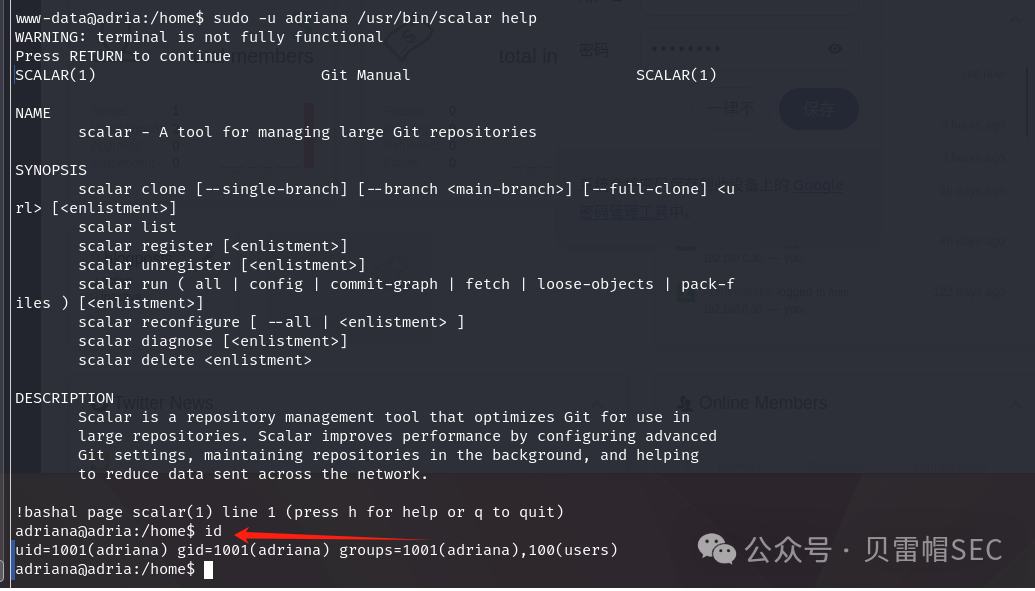 查看sudo -l 可以看到adriana 用户可以使用scalar命令, Scalar 一个用于管理大型 Git 存储库的工具