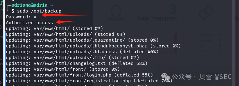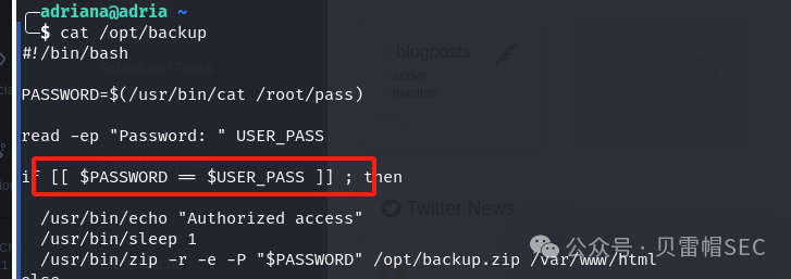 该脚本检索存储在/root/pass中的 root 密码。然后,它提示用户输入密码。如果输入的值与$PASSWORD变量中存储的密码匹配,则会打印“授予访问权限”消息,然后将html目录压缩到 .zip 文件中,并使用/root/pass中存储的密码进行加密。如果值不同,它只会打印“访问被拒绝”消息。