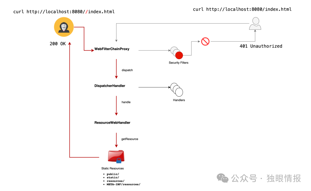 攻击者可以通过构造特殊的URL路径来绕过安全过滤器,避开对受保护资源的检查。例如,如果要保护/index.html,攻击者可以将URL改为//index.html。由于安全过滤器执行严格的路径匹配,这种情况下就不会触发检查,可能导致资源失去保护。如果所有安全过滤器都被绕过,就可能导致未经授权的访问。