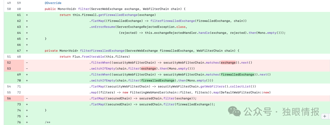 解决方案主要是加强了请求验证。具体来说,在安全链中引入了一个防火墙来验证请求,确保请求在到达过滤器链之前就经过验证。你可以在上面的GitHub提交中查看具体修改:GitHub提交记录。这次更新引入了ServerWebExchangeFirewall(具体是StrictServerWebExchangeFirewall)并增加了额外的验证方法。
