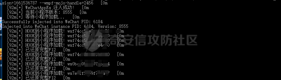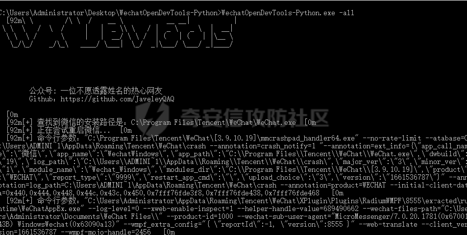 强制开启Devtools我用的是https://github.com/JaveleyQAQ/WeChatOpenDevTools-Python这个项目。对应使用的微信版本是WeChatSetup-3.9.10.19 微信的历史版本可以在https://github.com/tom-snow/wechat-windows-versions/tags下载。这里需要注意一下的是,如果电脑上安装了高版本的微信,需要先卸载掉,再安装低版本,否则hook的时候会失败。并且hook有风险,建议使用小号在虚拟机里运行。程序的运行很简单,退出微信后执行