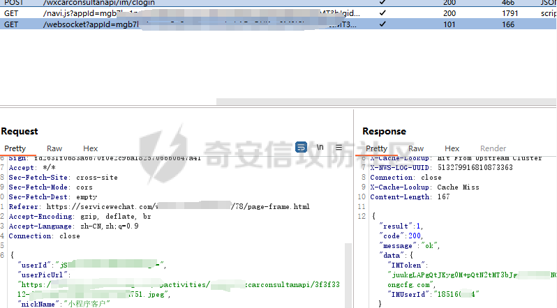 找到了接口,发送到repeater 尝试修改userid,发现仍然会返回token,说明这里没有身份验证,可直接接管任意用户的聊天会话。写个python利用websocket库切入websocket会话,成功接管会话内容。