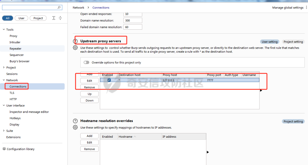 用于加载一个代理脚本,并监听7777端口,然后我们在burp中把数据包中转到7777端口,即可实现mitmproxy自动对数据包进行签名。burp设置如下: