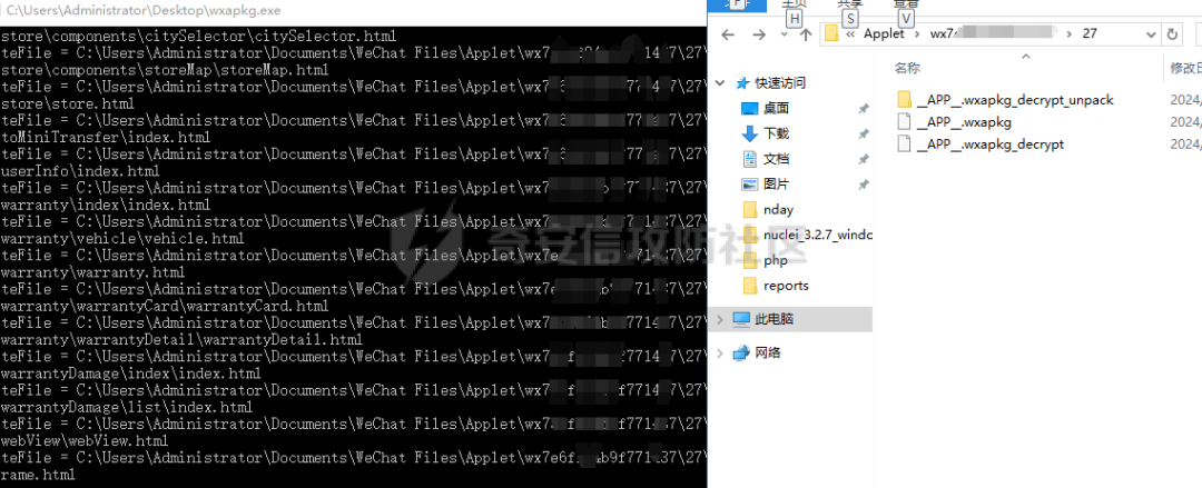 会看到一个__APP__.wxapkg,这个就是小程序的打包程序,需要对该文件进行解密,即可获取到小程序源码,解密脚本我使用的是https://github.com/zhuweiyou/wxapkg 直接把文件拖到exe程序的图标上便可以自动解密