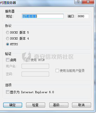 在peoxifier中新建代理服务器,ip和端口对应burp的监听端口,协议选择https