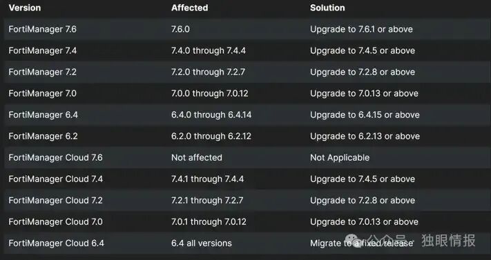 ,进一步加剧了组织保护其设备的紧迫性。Fortinet 针对不同版本的 FortiManager 提供了量身定制的解决方法: