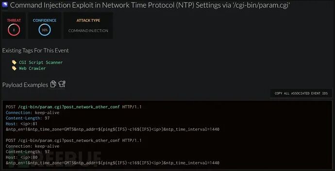 2024年4月,GreyNoise在其蜜罐网络上的AI驱动威胁检测工具Sift检测到异常活动,并发现了上述两个漏洞。值得一提的是,在事后复盘分析时,GreyNoise研究人员发现了一次针对摄像头的基于CGI的API和嵌入的’ntp_client’的利用尝试,旨在实现命令注入。