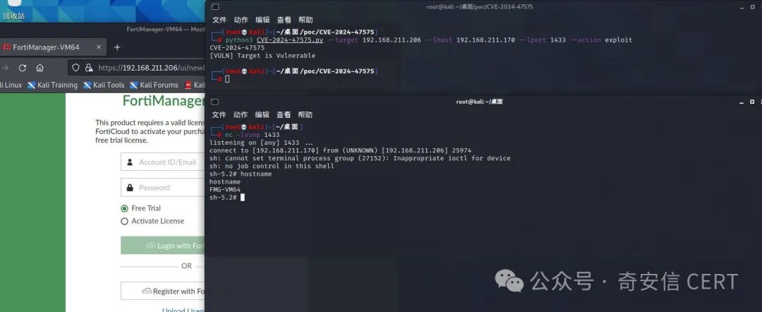 目前,奇安信威胁情报中心安全研究员已成功复现Fortinet FortiManager 身份认证绕过漏洞(CVE-2024-47575)****,截图如下: