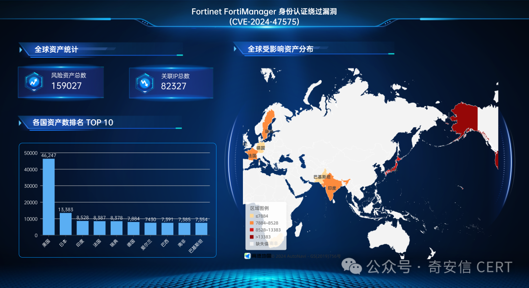 奇安信鹰图资产测绘平台数据显示,Fortinet FortiManager 身份认证绕过漏洞(CVE-2024-47575)关联的全球风险资产总数为159027个,关联IP总数为82327个。全球风险资产分布情况如下: