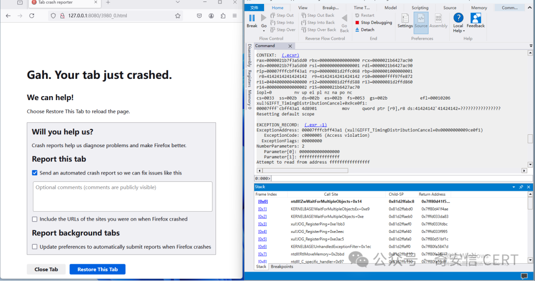 目前,奇安信威胁情报中心安全研究员已成功复现Mozilla Firefox 释放后重用漏洞(CVE-2024-9680)****,截图如下: