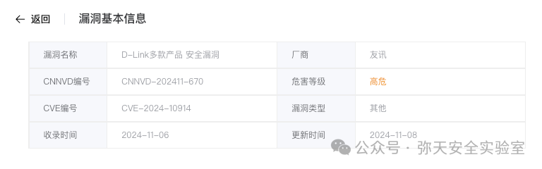 0x01漏洞介绍D-Link DNS-320等都是中国友讯(D-Link)公司的一款NAS(网络附属存储)设备。D-Link多款产品存在安全漏洞,该漏洞源于对参数name的错误操作会导致操作系统命令注入。以下产品及版本受到影响:D-Link DNS-320、DNS-320LW、DNS-325和DNS-340L 20241028版本及之前版本。0x02影响版本