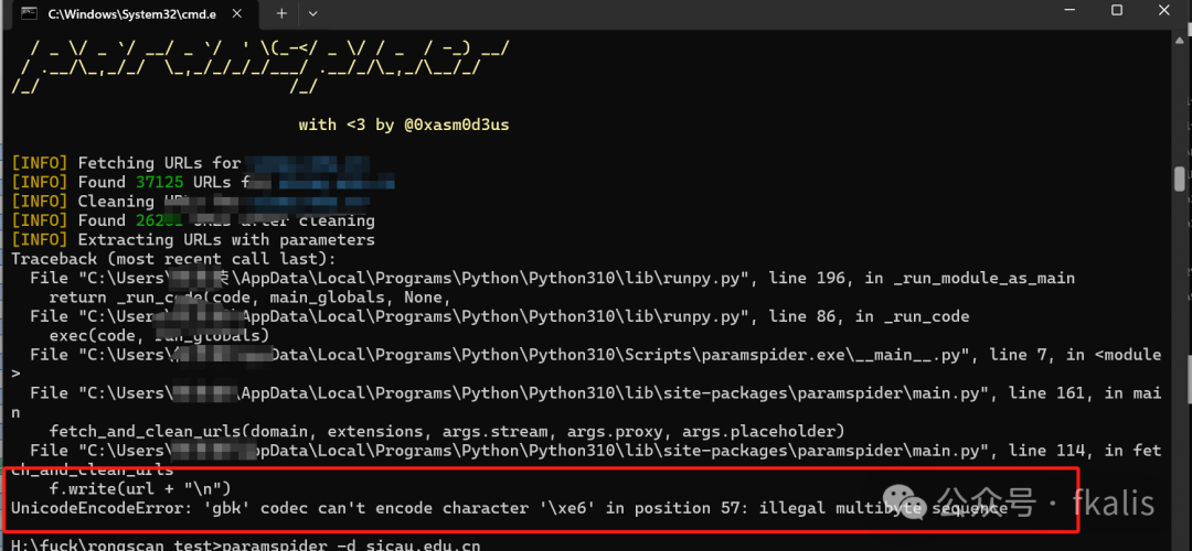 接下来,我使用 ParamSpider 收集所有可能的参数。我使用的命令是: