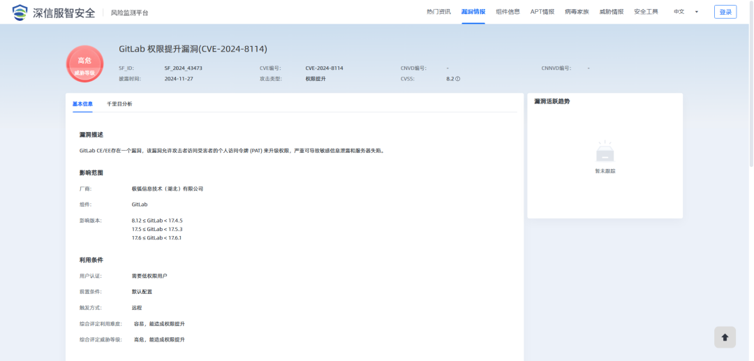 2024年11月27日,深瞳漏洞实验室监测到一则GitLab组件存在权限提升漏洞的信息,漏洞编号:CVE-2024-8114,漏洞威胁等级:高危。