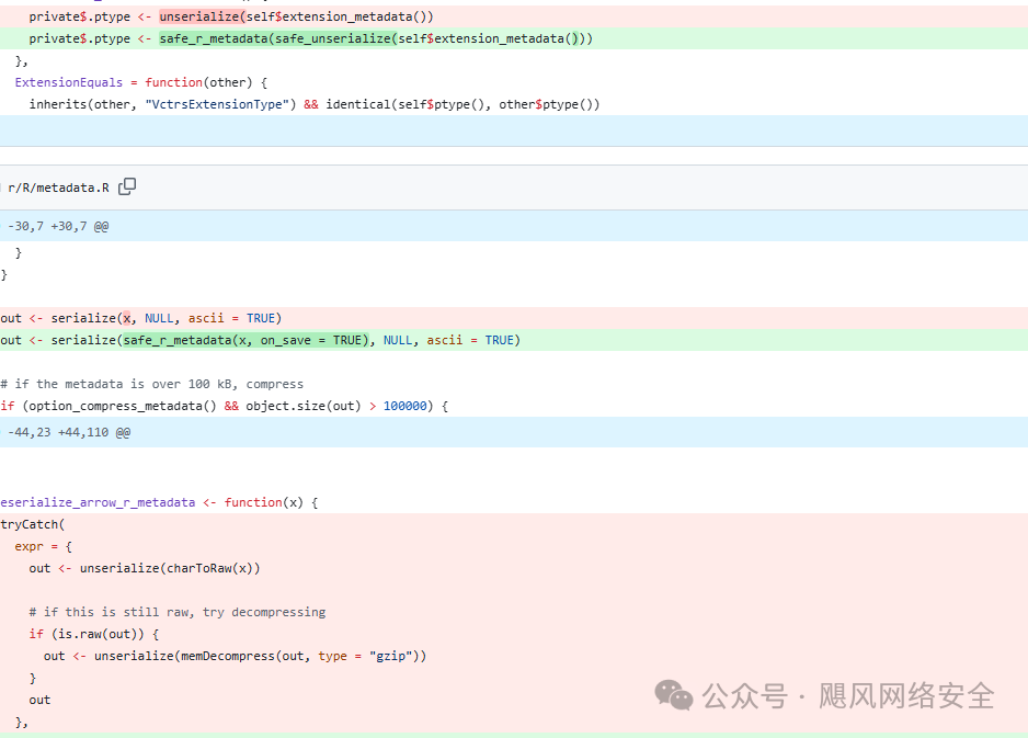 Apache Arrow是一种通用的列式格式和多语言工具箱,用于快速数据交换和内存分析,Apache Arrow R软件包是Apache Arrow项目的R语言组件,用于处理高性能的列式数据格式,它允许R语言用户高效地读取、写入和操作Arrow格式的数据,Apache Arrow R包中存在一个反序列化漏洞(CVE-2024-52338),该漏洞的CVSS评分为9.8,Apache Arrow R 包(版本 4.0.0 – 16.1.0)存在反序列化漏洞,该漏洞源于 IPC和Parquet数据读取器在处理元数据时未对输入进行严格验证,攻击者可通过构造恶意的Arrow IPC、Feather或Parquet 文件,在元数据中嵌入恶意对象,当应用程序加载这些文件时,unserialize() 函数会直接解析元数据,可能触发反序列化漏洞,从而导致任意代码执行。