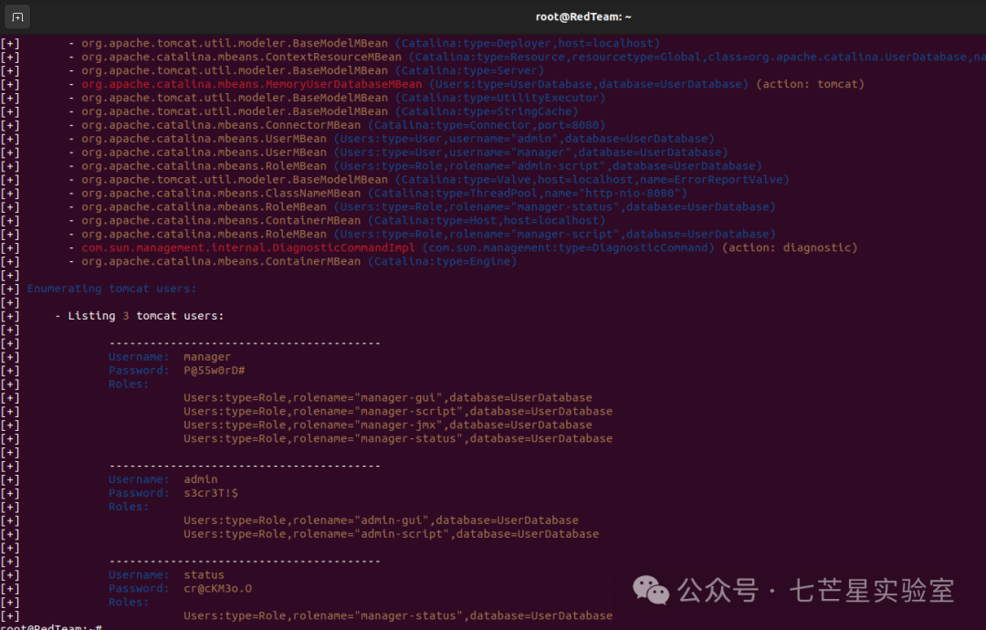 如果当不需要身份验证或者当指定了有效的凭据时,enum操作还会尝试从JMX端点枚举一些进一步的信息,包括非默认MBeans的列表,例如:在Apache tomcat服务器上注册的用户帐户