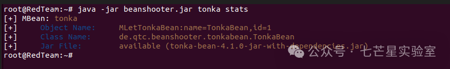 stats操作列出指定MBean的一些基本信息,这些信息是beanshooter本地存储的与相应MBean相关的数据,无需与服务器进行交互,Jar文件信息指示相应MBean的实现是否内置在beanshooter中,如果未使用–jar-file选项覆盖,则在部署过程中将使用该jar文件,目前TonkaBean是唯一一个具有可用Jar文件的MBean