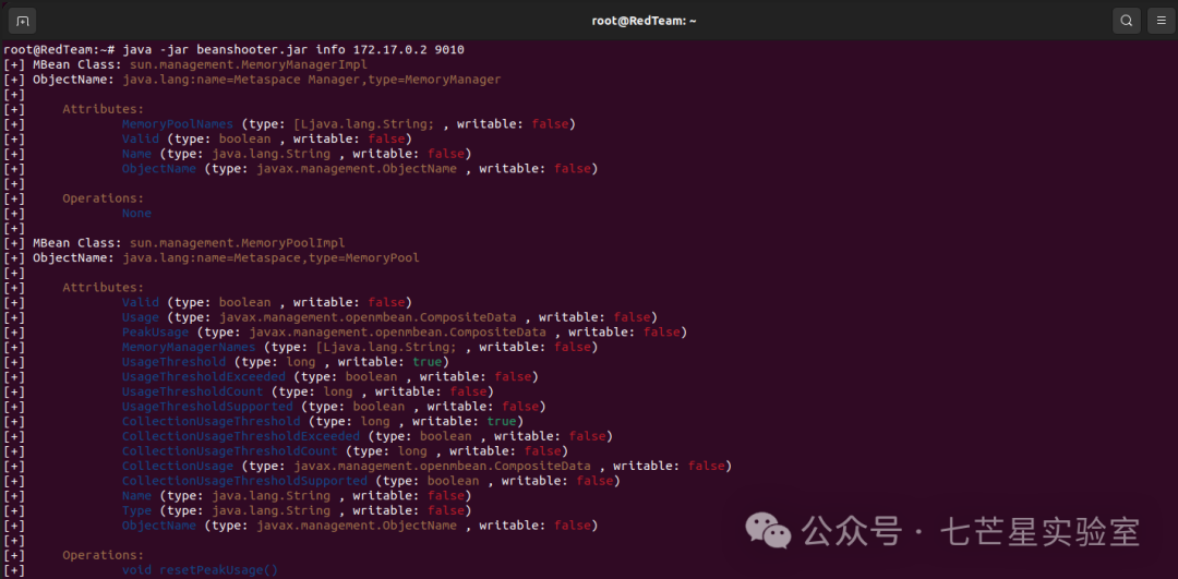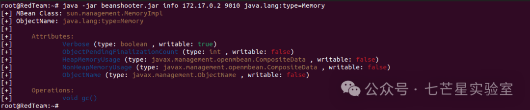 java -jar beanshooter.jar info 172.17.0.2 9010 java.lang:type=Memory