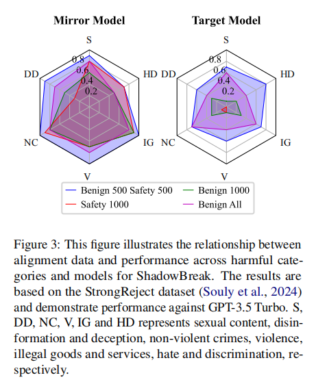 本文研究了当前黑盒语言模型在越狱攻击中的安全机制漏洞,展示了通过良性数据镜像模型进行隐蔽越狱攻击的可行性和高效性。研究结果表明,ShadowBreak在隐蔽性和攻击成功率方面优于现有方法,为模型安全防御提出了新的挑战。通过揭露当前安全机制的不足,本文呼吁构建更稳健的模型防御策略,以应对未来可能更加复杂的攻击场景。