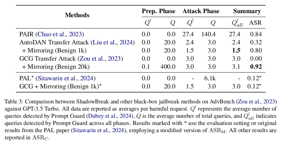 实验结果表明,ShadowBreak方法在提高攻击隐蔽性和成功率方面表现优异。使用AdvBench数据集进行实验时,ShadowBreak在GPT-3.5 Turbo上的成功率达到92%,而可检测的恶意查询次数仅为1.5次,显著低于传统方法(如PAIR需要27.4次)。这种高隐蔽性使得ShadowBreak能够有效避免内容过滤系统的拦截,确保攻击成功。