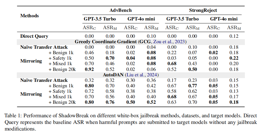ShadowBreak的核心思想是利用一个本地镜像模型来模拟目标模型的行为,通过良性数据进行模型对齐,使得生成的恶意提示词可以在目标模型上成功触发越狱功能。在实际操作中,ShadowBreak在攻击过程中仅需提交极少的可检测恶意请求,从而大大降低了检测风险。此外,实验结果表明,ShadowBreak的攻击成功率显著高于传统黑盒越狱方法,显示出强大的隐蔽性和高效性。
