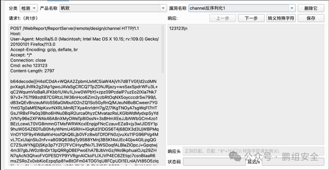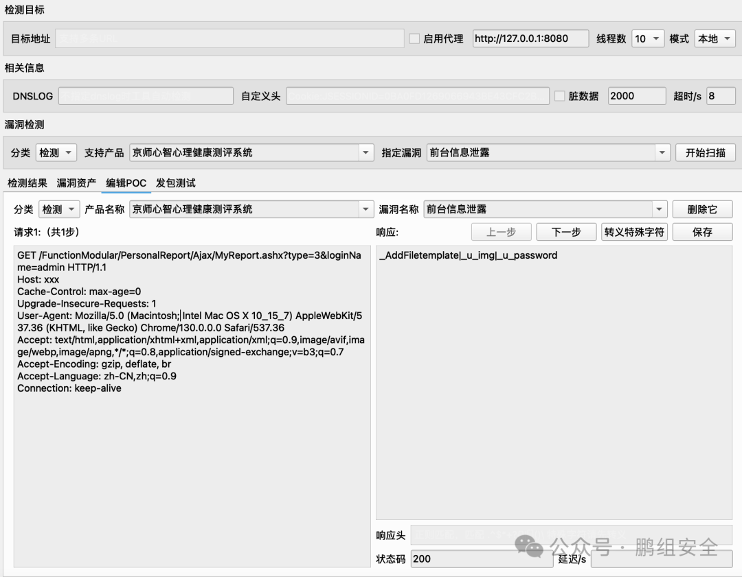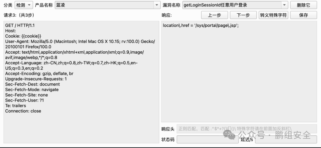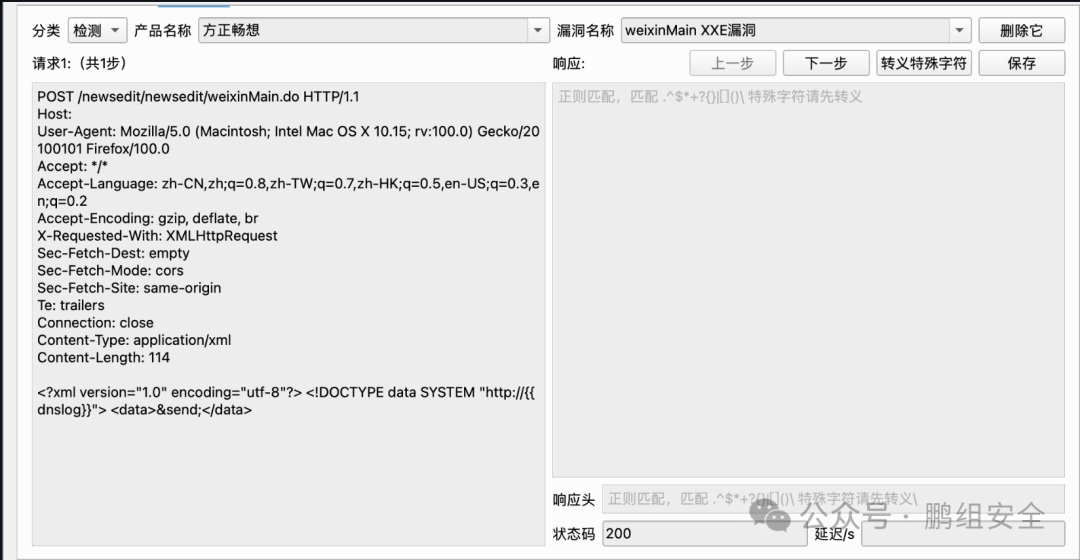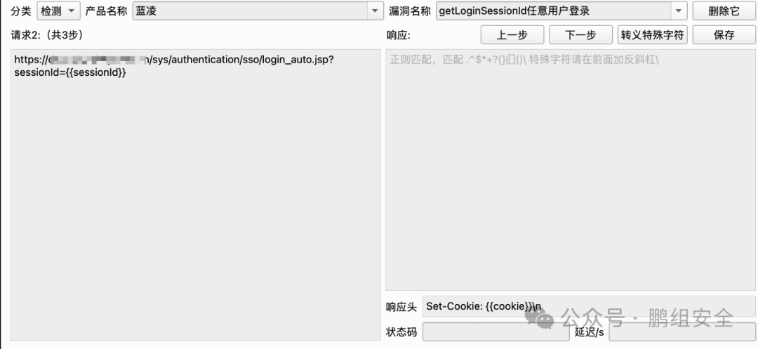 填写好产品名称、漏洞名称,然后将请求包复制出来,粘贴到请求1中,响应包中可以使用正则匹配,点击保存即可