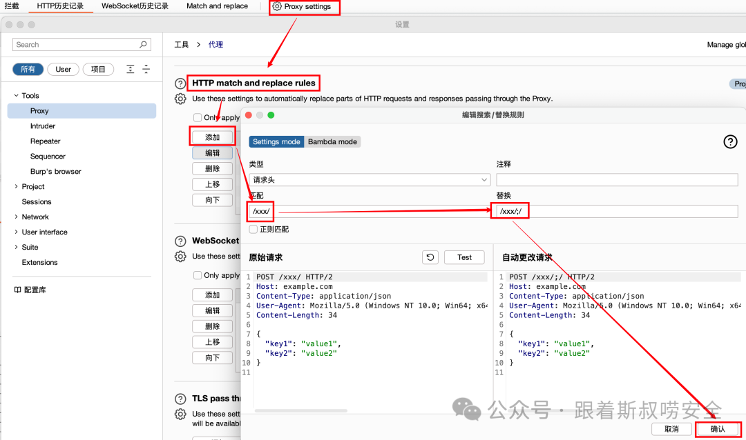 不过目前都是在burp里面访问这些资源,如何在浏览器里面自动的让url添加/;/呢?我们只需要在burp的代理模块里面按照下图的步骤添加一个规则,这时候经过burp的代理流量就会自动将匹配到一级目录/xxx/后面添加;/实现自动的shiro权限绕过了