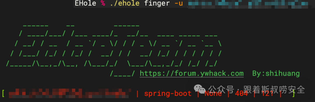 如果铁铁稍微有点基础,无论是从那醒目的“Whitelabel Error Page”几个大字还是绿叶子图标,都应该很快就能意识到,这是一个经典spring框架的404报错页面,如果不熟悉的宝子们也不要担心,随便找一个指纹识别工具也能精准得定位spring框架(斯叔这里用的是EHole扫描指纹的工具,github链接:https://github.com/EdgeSecurityTeam/EHole)。