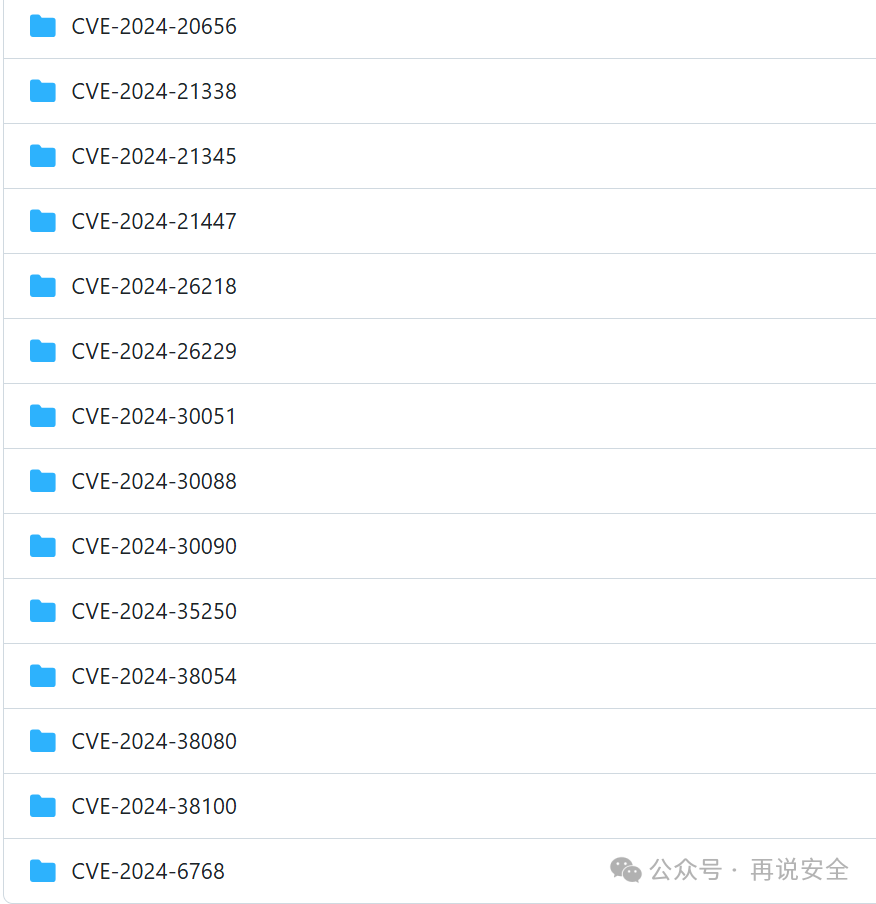 每个 CVE 文件夹可能包含有关漏洞的详细信息,包括利用代码、技术分析和潜在的缓解策略。