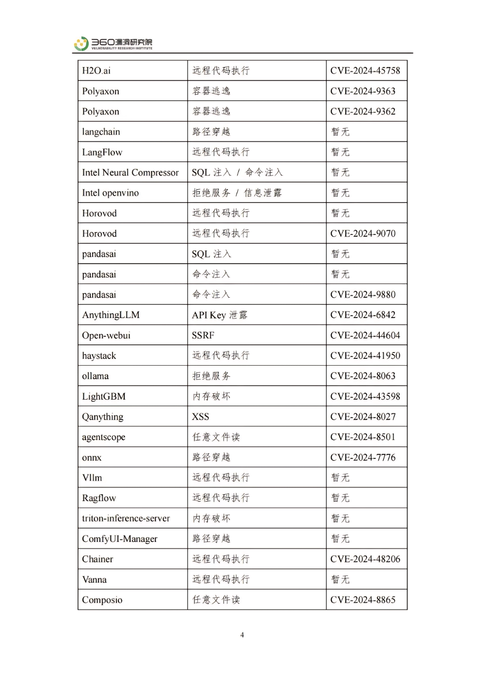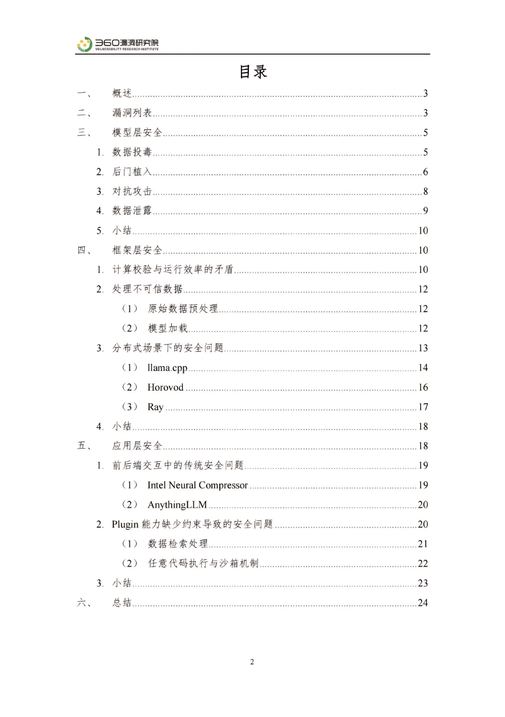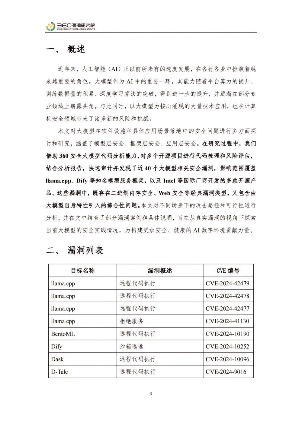 近日,360数字安全集团发布全球首份《大模型安全漏洞报告》(以下简称“报告”),从模型层安全、框架层安全以及应用层安全三大维度探查安全问题,并借助360安全大模型自动化的代码分析能力,对多个开源项目进行代码梳理和风险评估,最终审计并发现了近40个大模型相关安全漏洞,影响范围覆盖llama.cpp、Dify等知名模型服务框架,以及Intel等国际厂商开发的多款开源产品,全面呈现了全球大模型发展所面对的安全威胁态势,为构建更加安全、健康的AI数字环境贡献力量。