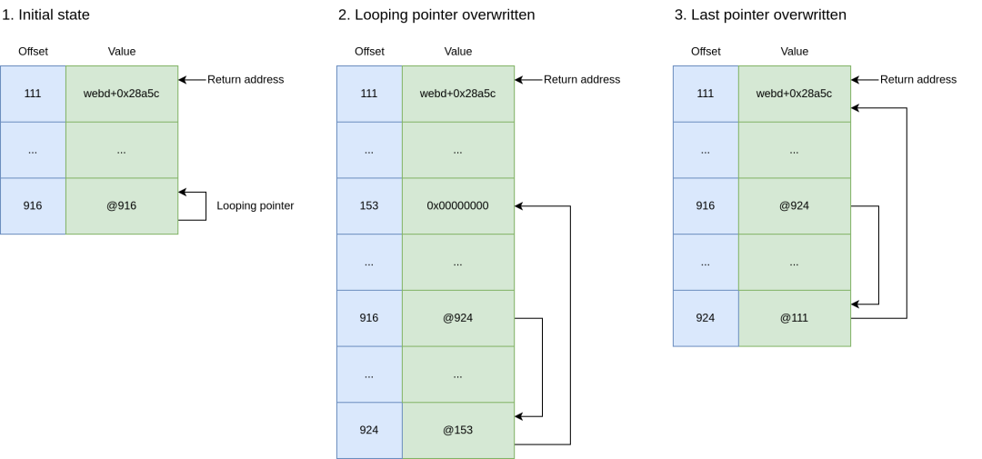 我们利用的第一步是获得对栈的任意写入访问。由于没有内存泄漏,我们必须进行盲目操作。我们找到一个可以修改的循环指针,使其指向栈中另一个包含有效栈指针的区域。通过改变其最低有效字节(LSB),我们创建了一个双指针,使得可以使用第一个指针修改第二个指针,有效地指向栈上的任意位置。这使我们能够在不需要知道确切地址的情况下,写入一个可预测的栈位置。