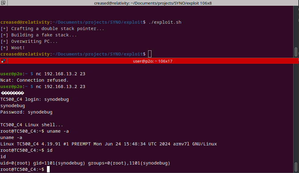 此漏洞影响了版本为1.1.1-0383的 Synology TC500 和 BC500 摄像头,并在版本1.1.3-0442中得到修复(详见更新日志),这意味着该漏洞利用在 Pwn2Own 比赛期间无法执行。