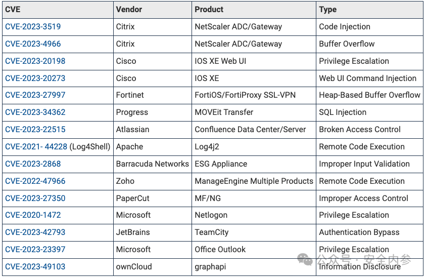 在这份联合公告中,网络安全机构列出了2023年最常被黑客利用的前15个漏洞,其中影响思杰公司(Citrix)NetScaler网络产品的CVE-2023-3519漏洞位居榜首。