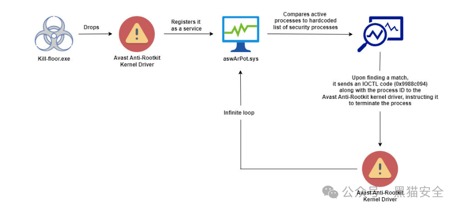 特里克斯报告中写道:“恶意软件(kill-floor.exe)的感染链开始于将合法的Avast Anti-Rootkit驱动程序(aswArPot.sys)下降到‘C:\Users\Default\AppData\Local\Microsoft\Windows’目录中的‘ntfs.bin’文件中。”