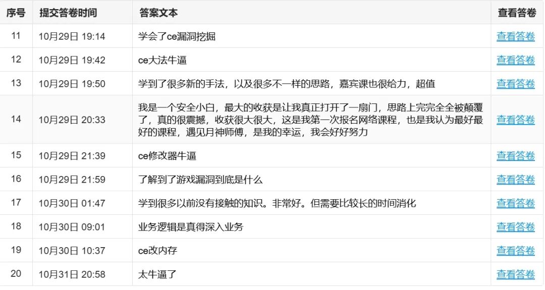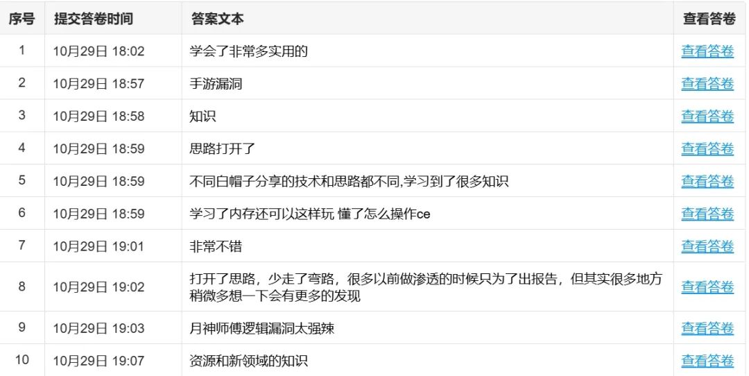 为了了解大家对课程的真实看法,我们在第二期课程结束后进行了调查问卷。结果没想到大家这么给面子,这也超出了我的预期,反馈还挺好的!大家说这个课程教会了他们如何进行CE漏洞挖掘,甚至有人用“ce大法牛逼”来形容。看来我是把内存漏洞挖掘已经教到位了。这也达到了我开这门课的初衷,我希望大家在我这里学到的不仅仅是技术,更是全新的思路和手法!