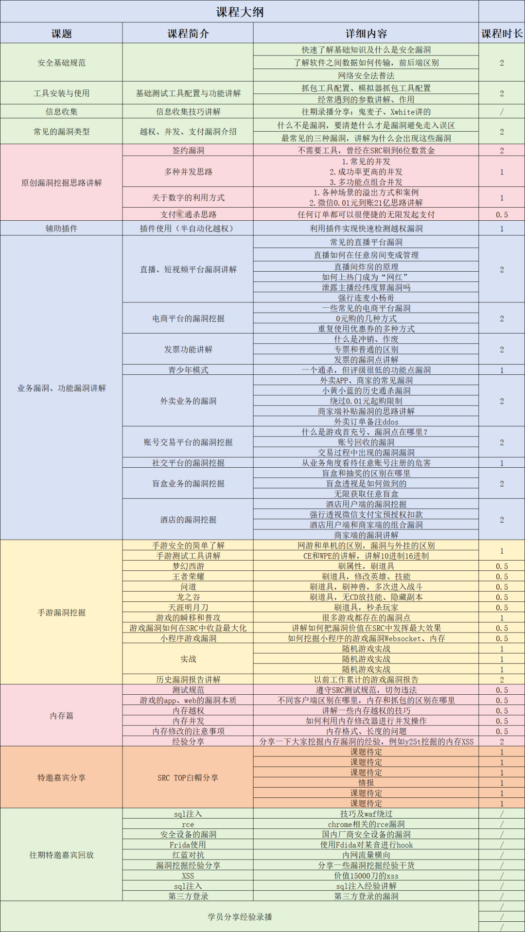 本期依然会邀请4个头部白帽大佬做不同方向的专题分享,作为彩蛋送给我们的学员。他们将分别就各自擅长的领域进行精彩的主题分享。大家应该知道,大佬平时分享的机会极为难得,但我们课程的学员可以和这些大佬互动答疑。简单透露一个,这期课程会请到一位大佬,给大家分享情报挖掘。相信这也会给各位师傅带来全新的视角,帮助大家开阔视野,打开思路。